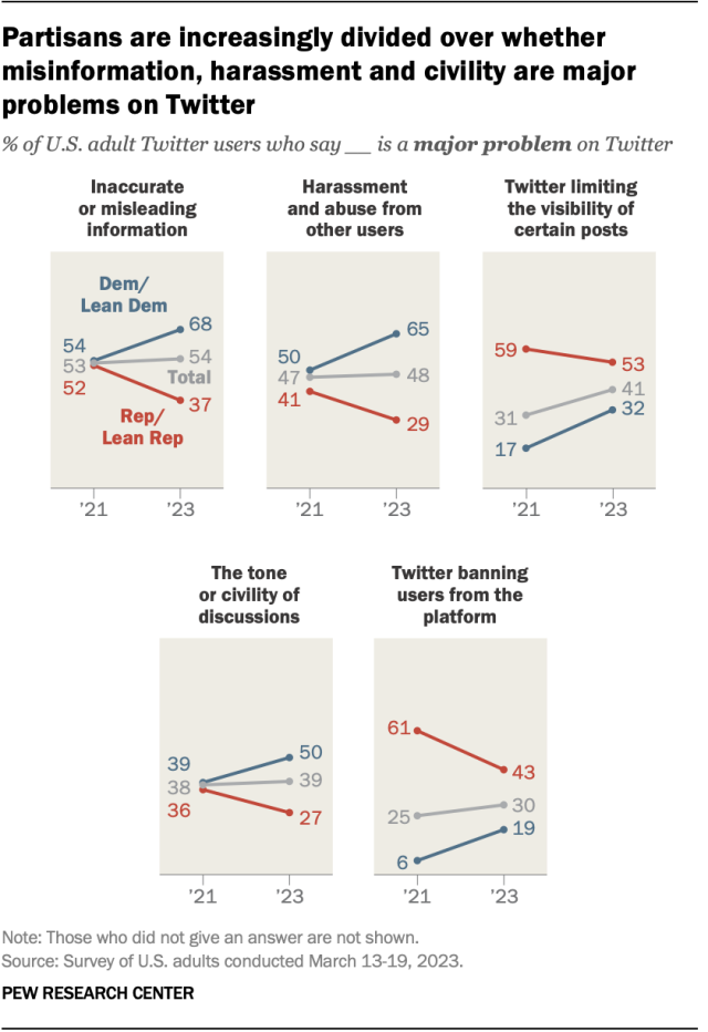 A collection of charts showing a partisan divide over whether misinformation, harassment and civility are major problems on Twitter.